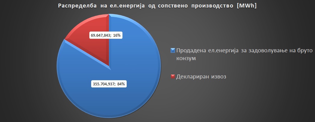 Од сопственото производство 83,6% е продадено за задоволување на бруто конзумот односно 355,705 GWh, а 16,4% односно 69,648 GWh е деклариран извоз.