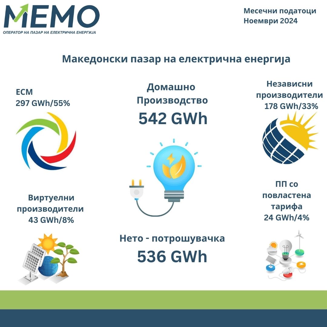 Во ноември 2024 година, согласно податоците на Националниот оператор на пазар на електрична енергија – МЕМО, за задоволување на вкупната потрошувачка во Република Северна Македонија, реализирани се трансакции на учесниците на пазарот на електрична енергија односно бруто-конзум, во висина од 658 GWh.