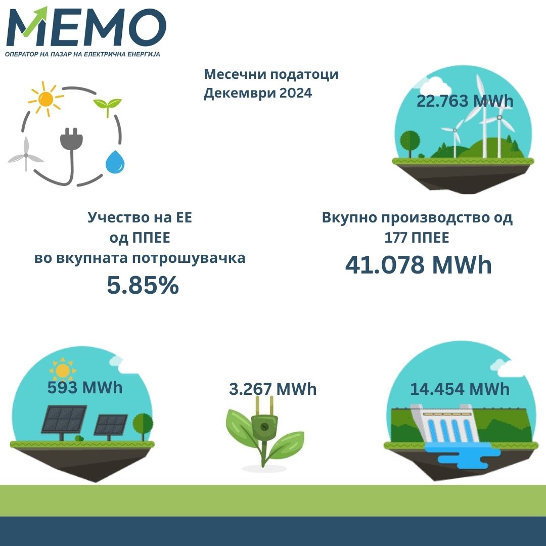 Во декември 2024 година, согласно податоците на Националниот оператор на пазар на електрична енергија – МЕМО, од 177 повластени производители на електрична енергија од обновливи извори во земјава произведени се 41.078 MWh, што претставува зголемување од 29% во однос на декември 2023 година.