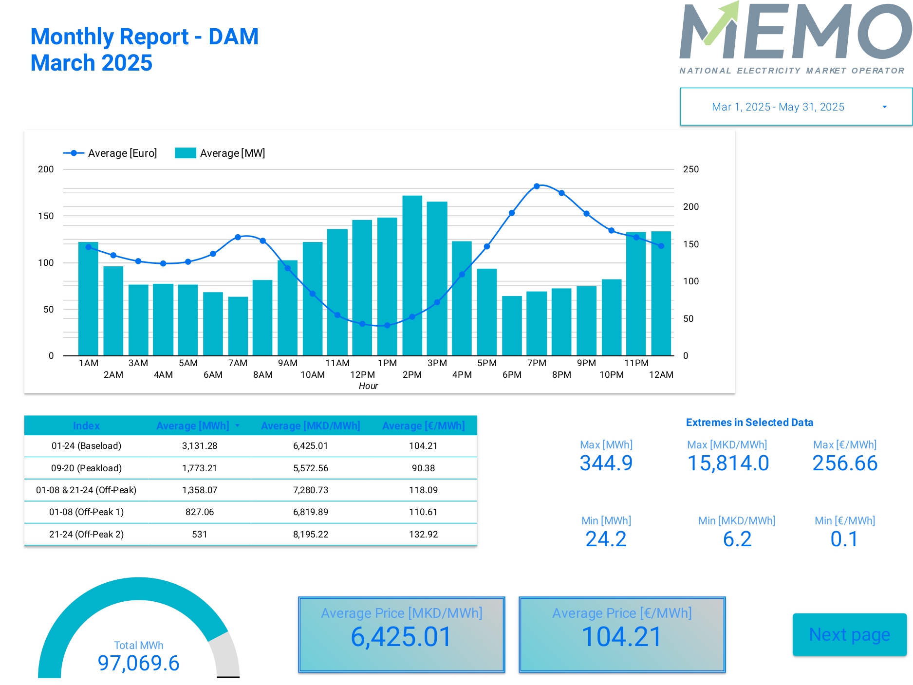 Согласно извештајот на Националниот оператор на пазар на електрична енергија – МЕМО ДООЕЛ Скопје, за тргување со електрична енергија ден однапред, во месец март истргувани се вкупно 97.069,6 MWh, по просечна цена од 6.425, 01 денари или 104,21 евра MWh.