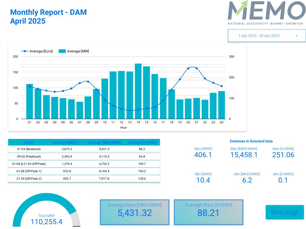 According to the report of the National Electricity Market Operator—MEMO DOOEL Skopje—for day-ahead electricity trading, 110.255, 4 MWh was traded in April at an average price of 88,21 EUR/MWh (5.431,32 MKD/MWh).