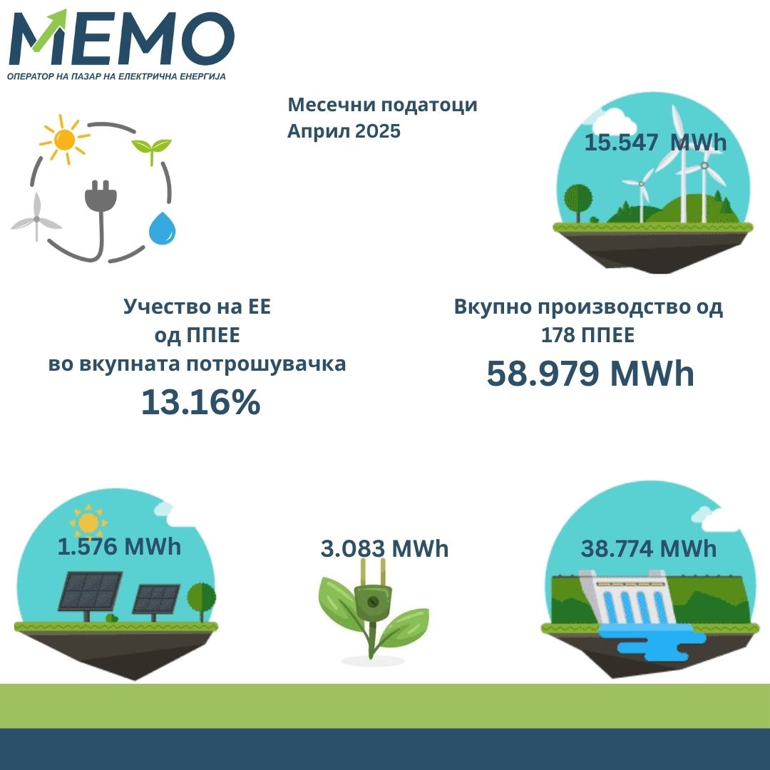 Во април 2025 година, согласно податоците на Националниот оператор на пазар на електрична енергија – МЕМО, од 178 повластени производители на електрична енергија од обновливи извори во земјава произведени се 58.979 MWh.