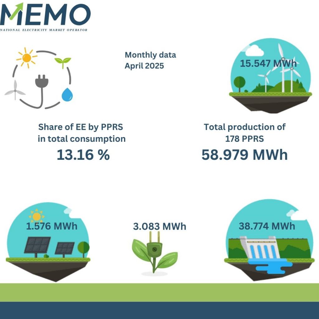 According to data from the National Electricity Market Operator (MEMO), 178 preferential producers produced 58.979 MWh of electricity from renewable sources in April 2025.