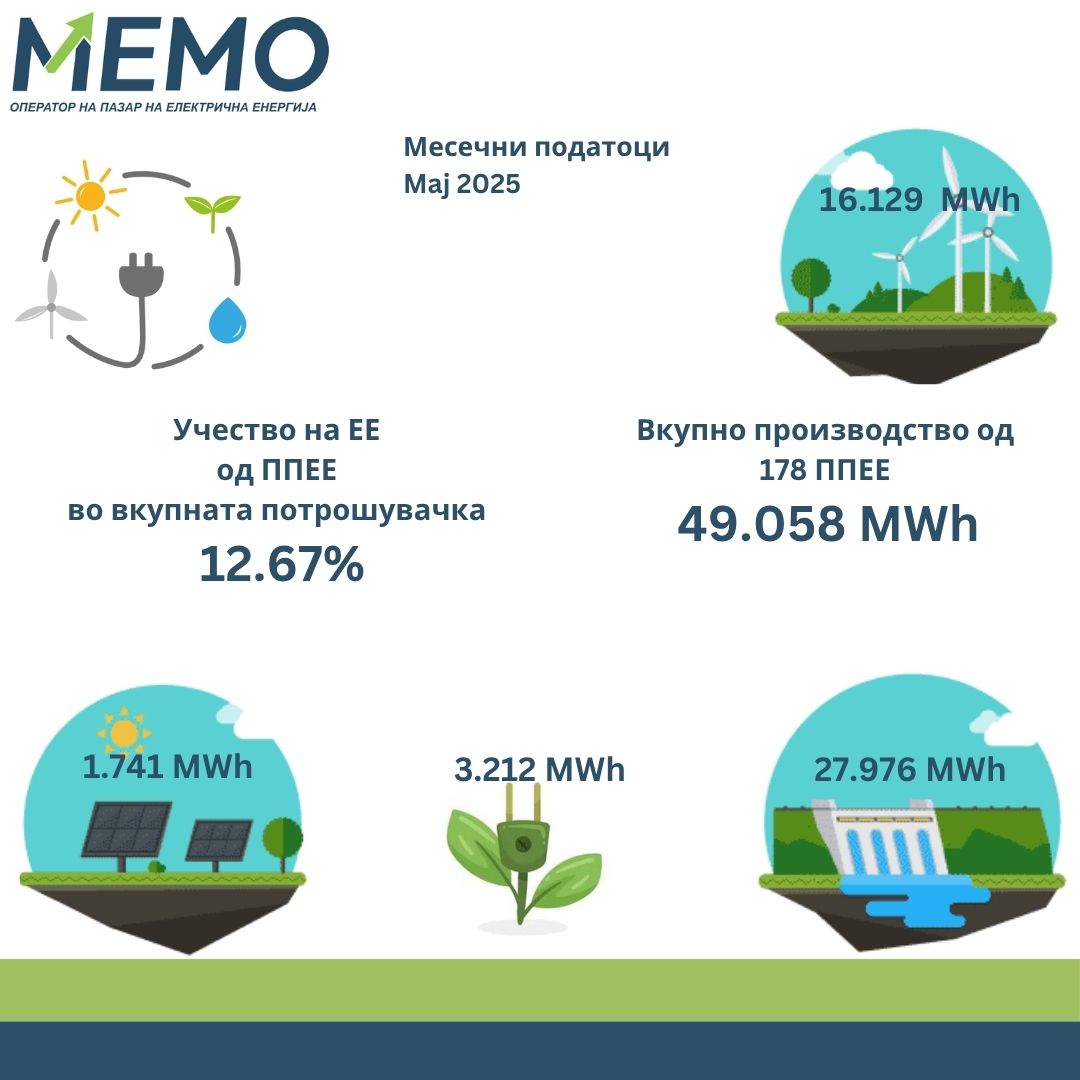 Во мај 2025 година, согласно податоците на Националниот оператор на пазар на електрична енергија – МЕМО, од 178 повластени производители на електрична енергија од обновливи извори во земјава произведени се 49.058 MWh.