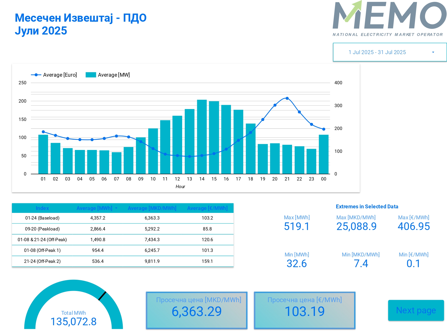Согласно извештајот на Националниот оператор на пазар на електрична енергија – МЕМО ДООЕЛ Скопје, во рамки на пазарот ден однапред, во месец јули беа истргувани вкупно 135.072,8 MWh електрична енергија, по просечна цена од 6.363,29 денари или 103,19 евра за MWh. Со ова е постигнат нов месечен рекорд на тргување со електрична енергија на пазарот ден однапред.