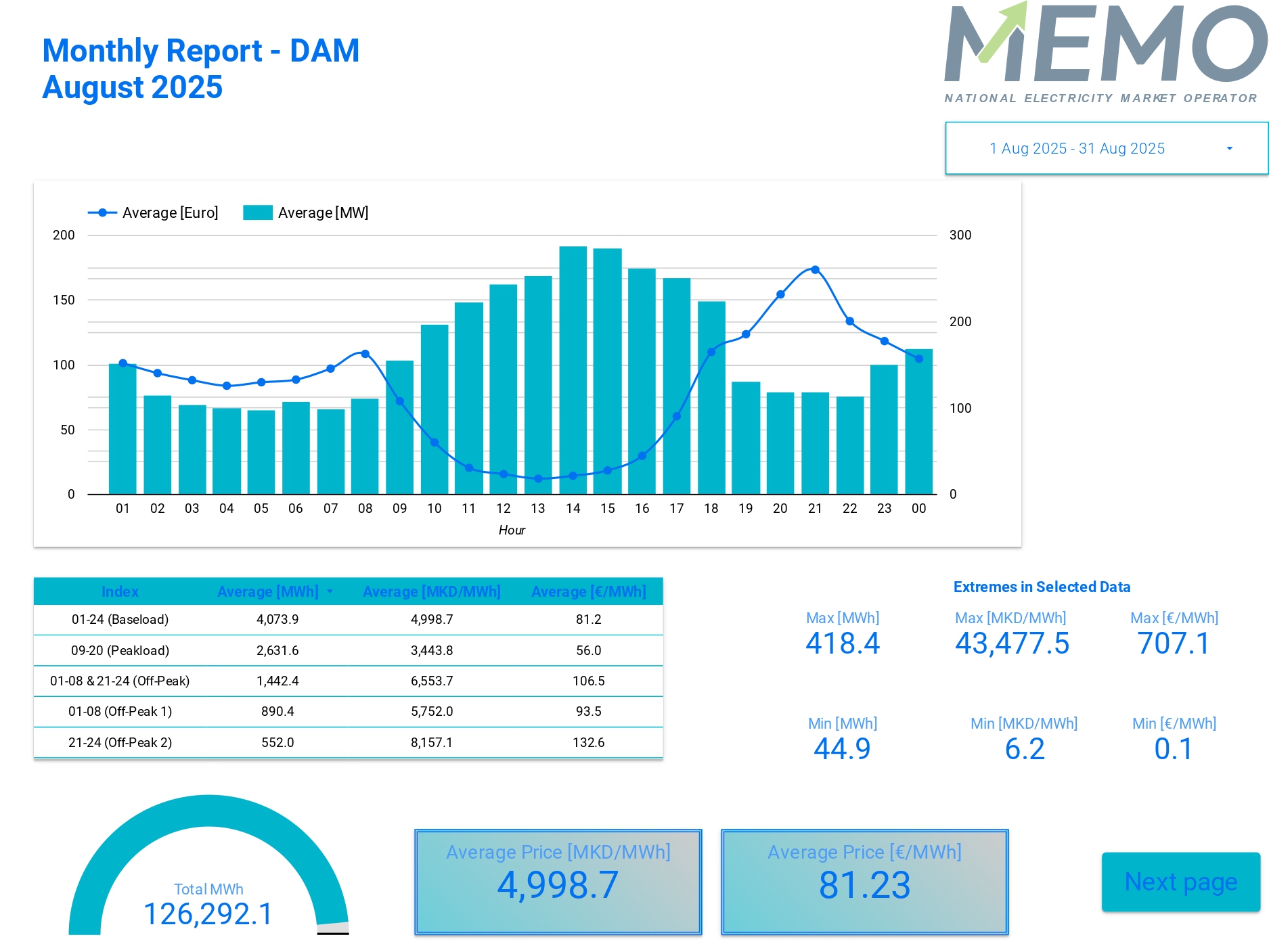 Согласно извештајот на Националниот оператор на пазар на електрична енергија – МЕМО ДООЕЛ Скопје, за тргување со електрична енергија ден однапред, во месец август истргувани се вкупно 126.292,1 MWh по просечна цена од 4.998,7 денари или 81,23 евра MWh.