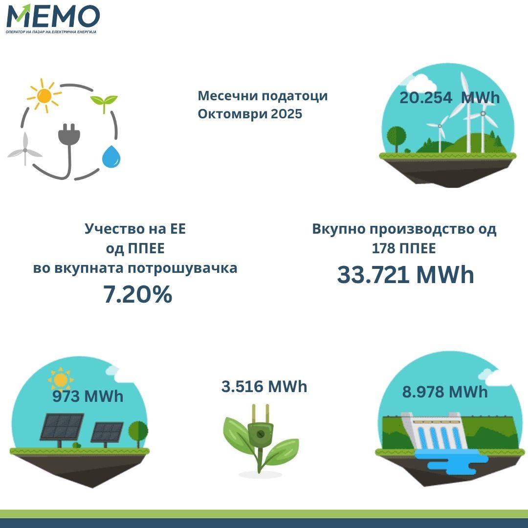 Во октомври 2025 година, согласно податоците на Националниот оператор на пазар на електрична енергија – МЕМО, од 178 повластени производители на електрична енергија од обновливи извори во земјава произведени се 33.721 MWh.