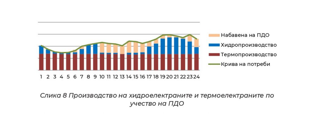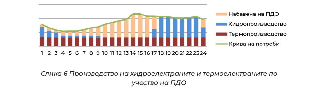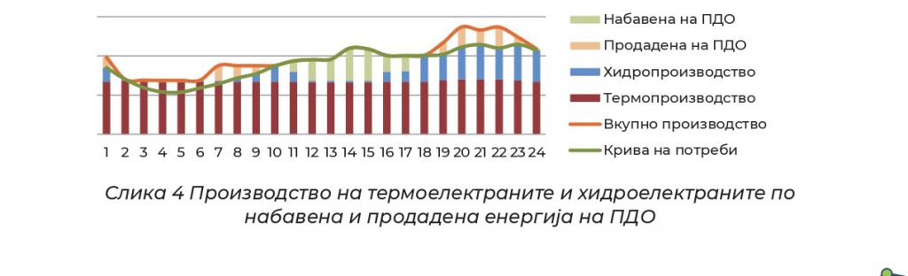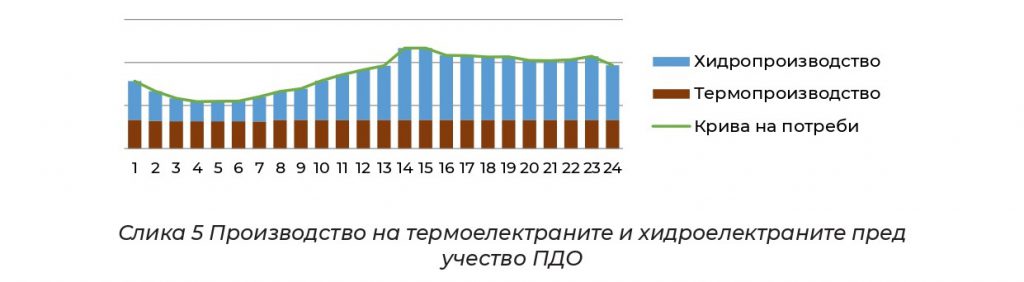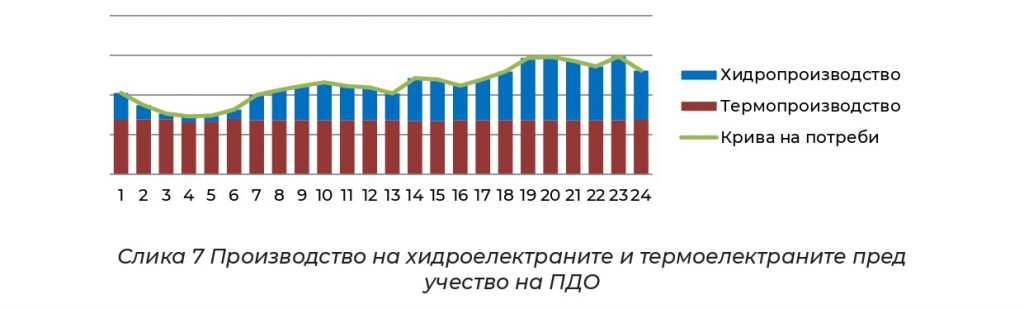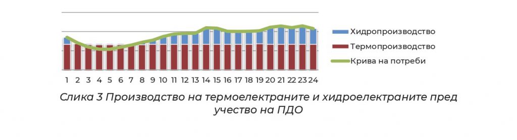 На Слика 3 е претставена кривата на потреби на АД ЕСМ и распределбата на производството од термоелектрани и хидроелектрани пред учество на ПДО за задоволување на истата. Се забележува дека во утринските часови има вишоци на производство од термоелектраните, кои би оделе во систем и дека има одредено количество на електрична енергија кое би требало да биде произведено од хидроелектраните.