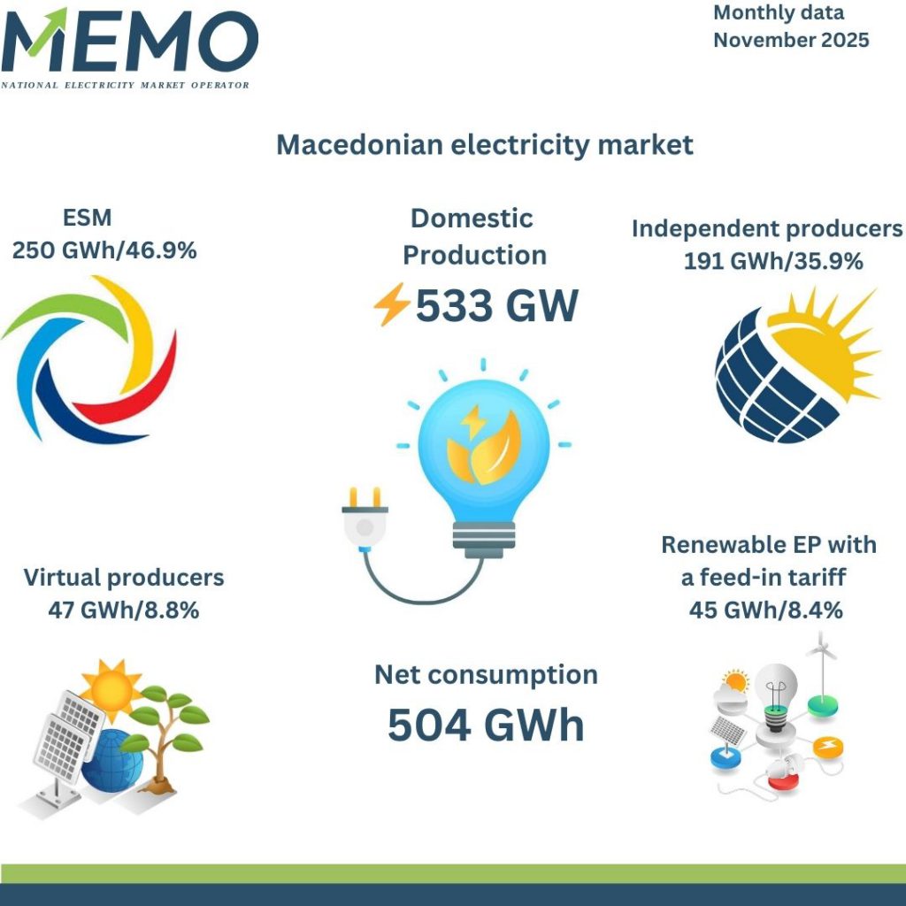 According to data from the National Electricity Market Operator (MEMO), in November 2025, 504 GWh of electricity was sold to meet the country’s total electricity consumption, excluding losses, i.e., net consumption.