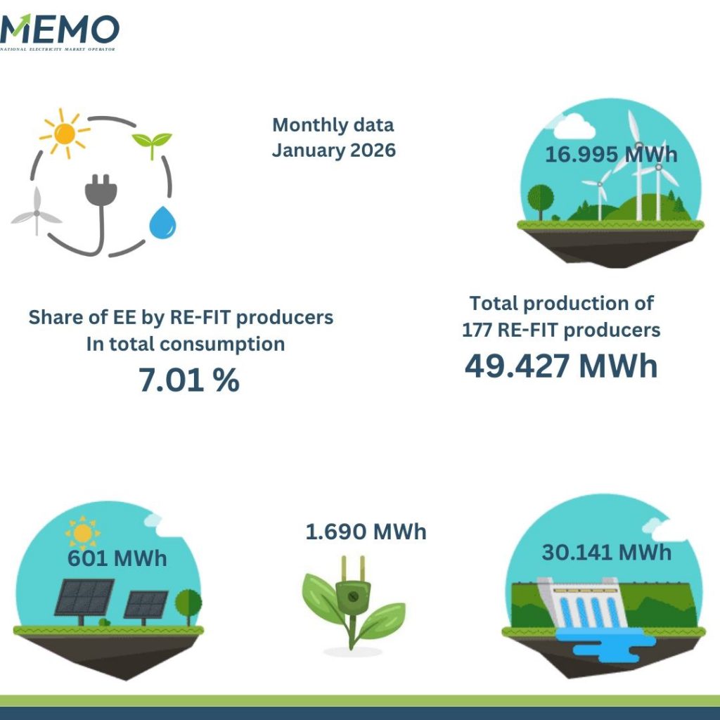 According to data from the National Electricity Market Operator (MEMO), 177 renewable electricity producers with a feed-in tariff (FIT) produced 49.427 MWh of electricity in January 2026.