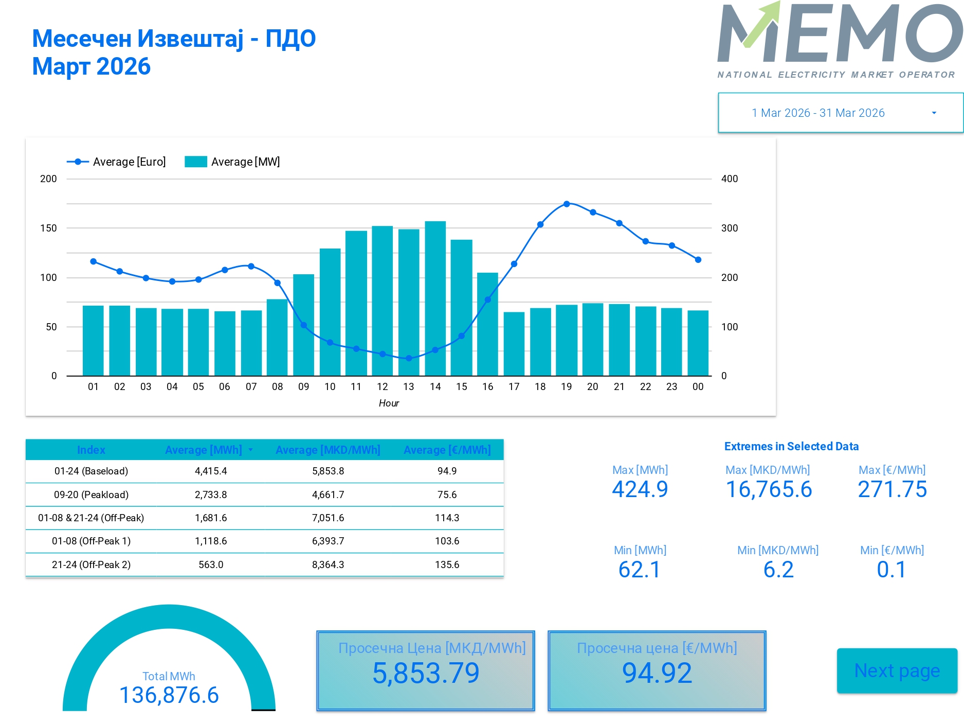 Согласно извештајот на Националниот оператор на пазар на електрична енергија – МЕМО ДООЕЛ Скопје, за тргување со електрична енергија ден однапред, во месец март истргувани се вкупно 136.876,6 MWh по просечна цена од 5.853,79 денари или 94,92 евра/MWh.