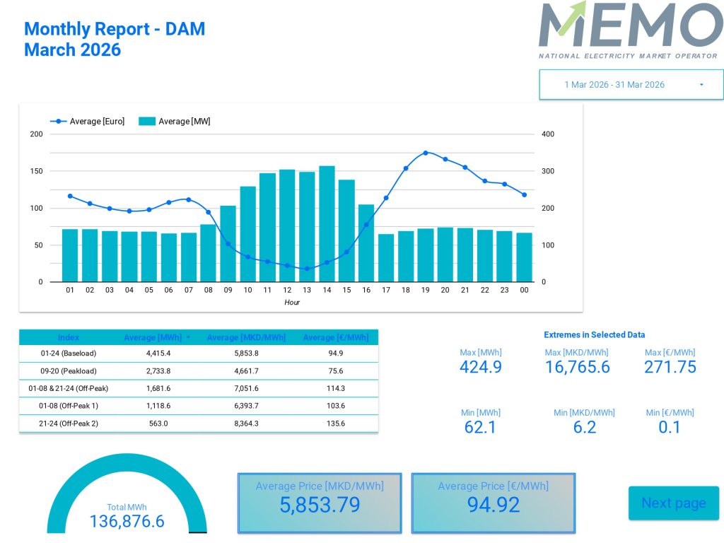 According to the report of the National Electricity Market Operator—MEMO LLC—for day-ahead electricity trading, 136.876,6 MWh was traded in March at an average price of 94,92EUR/MWh (5.853,79 MKD/MWh).