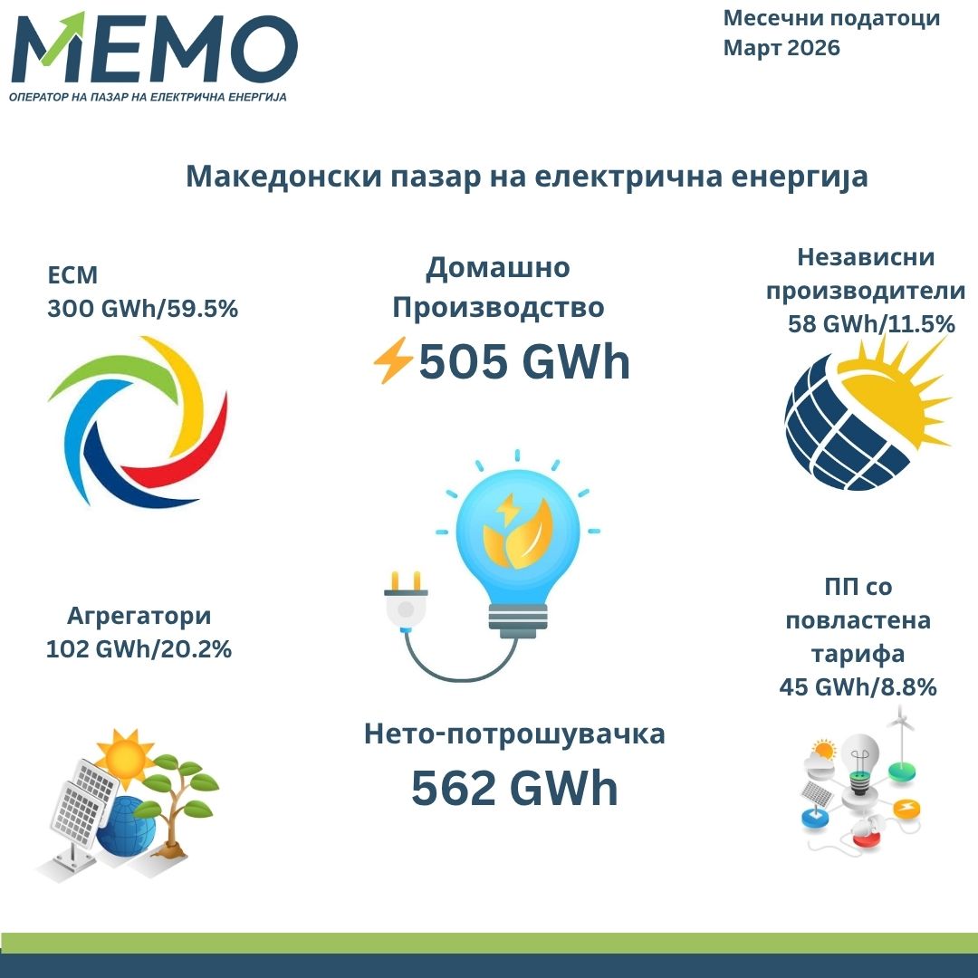 Во март 2026 година, согласно податоците на Националниот оператор на пазар на електрична енергија – МЕМО, за задоволување на севкупната потрошувачка на електрична енергија во државата, без загубите, поточно нето-потрошувачката, продадена е електрична енергија од 562 GWh.